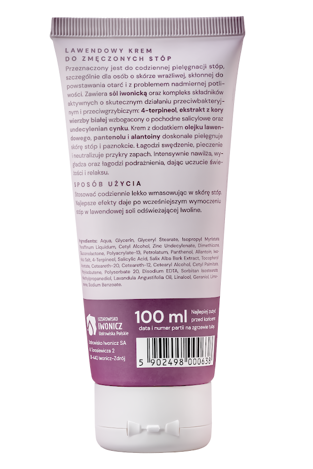 Przeznaczony jest do codziennej pielęgnacji stóp, szczególnie dla osób o skórze wrażliwej, skłonnej do powstawania otarć i z problemem nadmiernej potliwości. Zawiera sól iwonicką oraz kompleks składników aktywnych o skutecznym działaniu przeciwbakteryjnym i przeciwgrzybiczym: 4-terpineol, ekstrakt z kory wierzby białej wzbogacony o pochodne salicylowe oraz undecylenian cynku. Krem z dodatkiem olejku lawendowego, pantenolu i alantoiny doskonale pielęgnuje skórę stóp i paznokcie. Łagodzi swędzenie, pieczenie i neutralizuje przykry zapach. Intensywnie nawilża, wygładza oraz łagodzi podrażnienia, dając uczucie świeżości i relaksu.